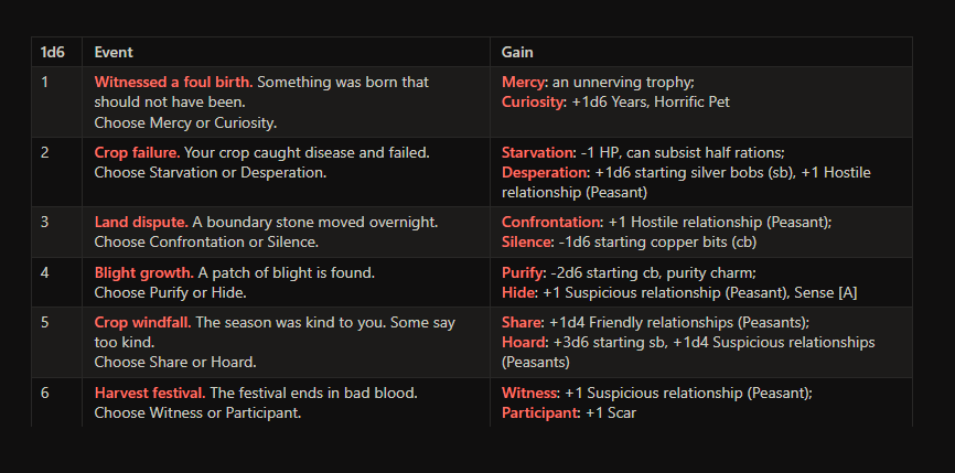 NOTE: Because there’s going to be a LOT of these, I’m just going to highlight one of the event tables: Agrarian Events. My best estimate has probably 10 or so more in the final rules
