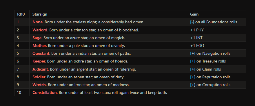 A Character’s Origin determines which Starsign they were born under, each with their own permanent effect. All Origins add +10 Years to the Character’s age.
