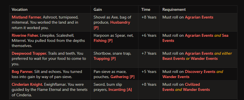 A Character’s Vocation determines which equipment, proficiencies or attunements, and life events made them who they are.