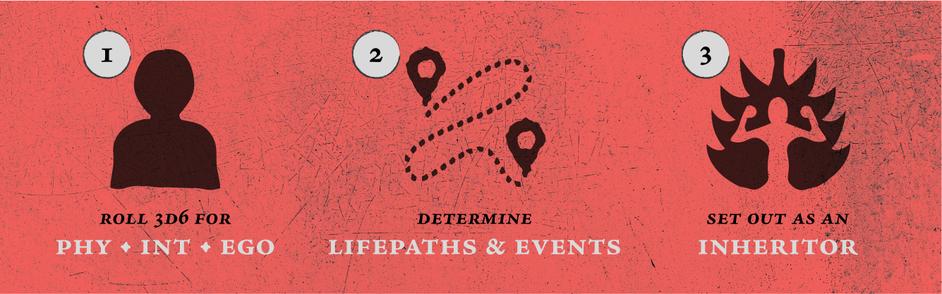 Once attributes have been determined, a Character’s Foundations can be discovered. If running a one-shot or for tables that don’t wish to linger on character creation, Pregenerated Characters are available.